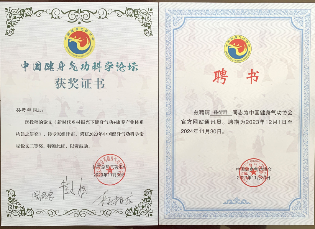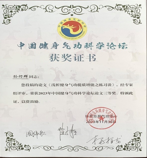 中心工会孙衍群同志在“2023年中国健身气功科学论坛”入选论文中获奖