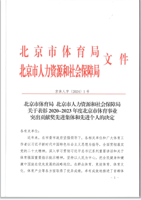 中心工会公益全民健身一队被评为“2020-2023年度北京市体育事业突出贡献奖先进集体”称号。