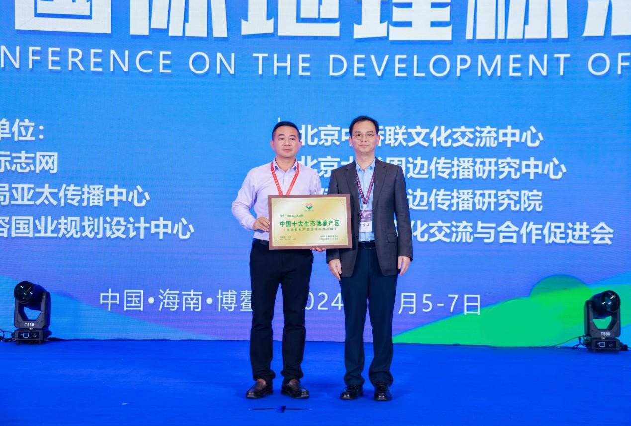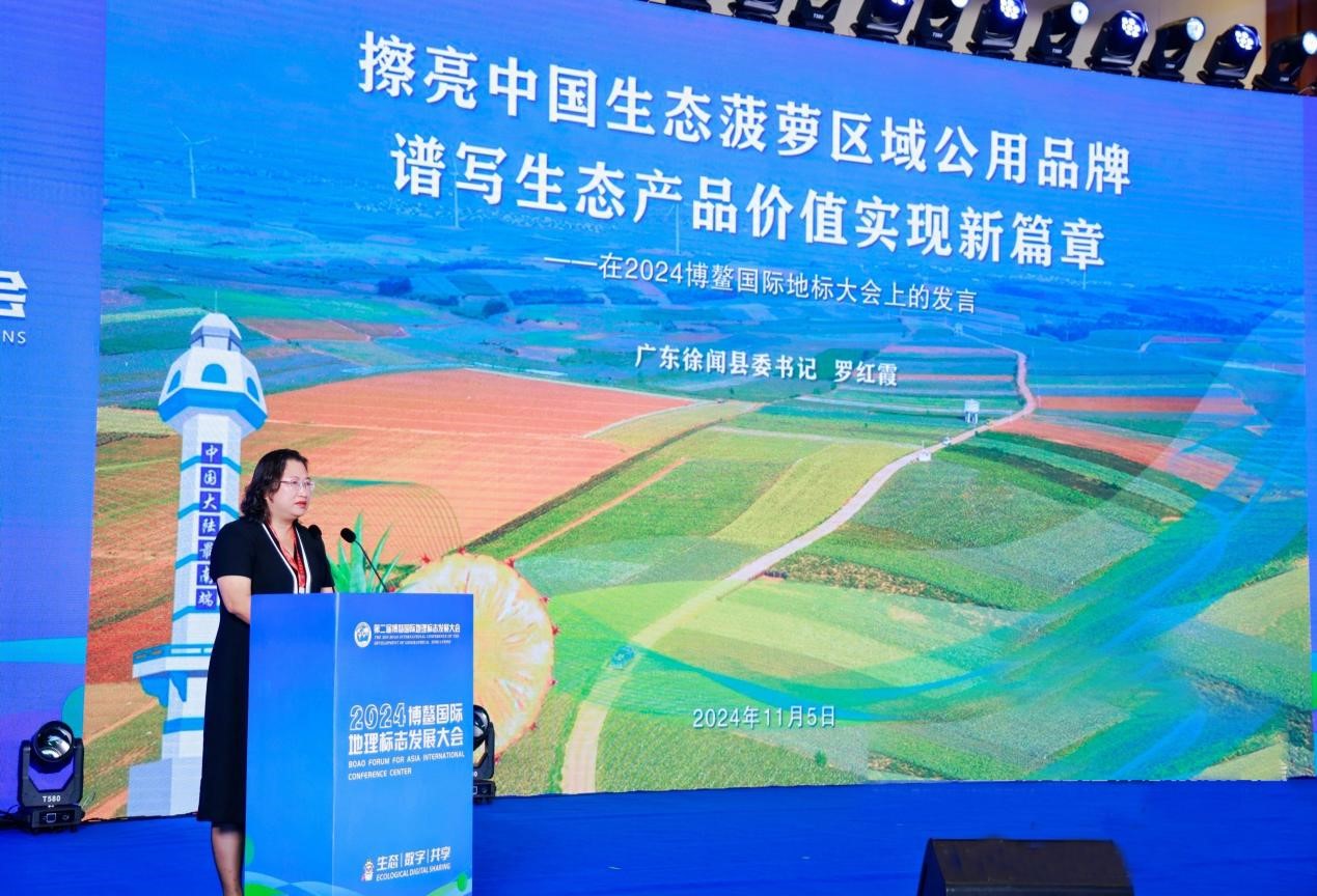 王汉平为徐闻县人民政府授牌《中国十大生态菠萝产区》,徐闻县委书记罗红霞在会上,向与会者介绍了该县依托菠萝生态原产地保护产品打造生态产品区域公用品牌与生态产品价值实现的成功经验。