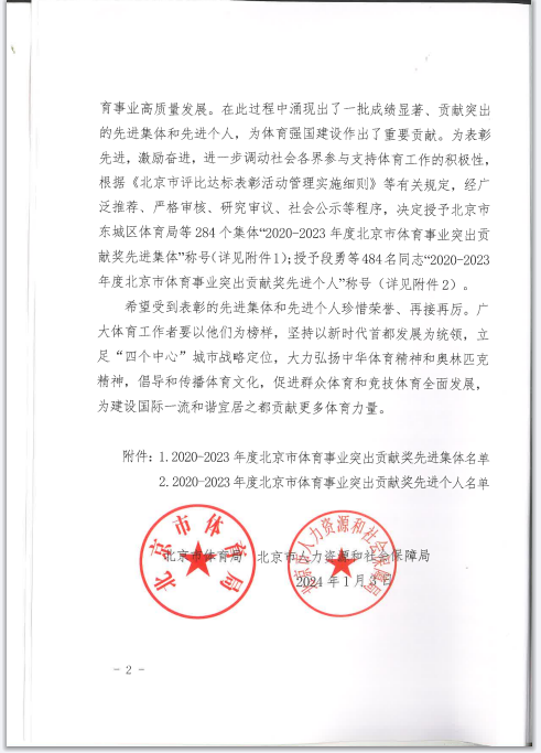 中心工会公益全民健身一队被评为“2020-2023年度北京市体育事业突出贡献奖先进集体”称号。